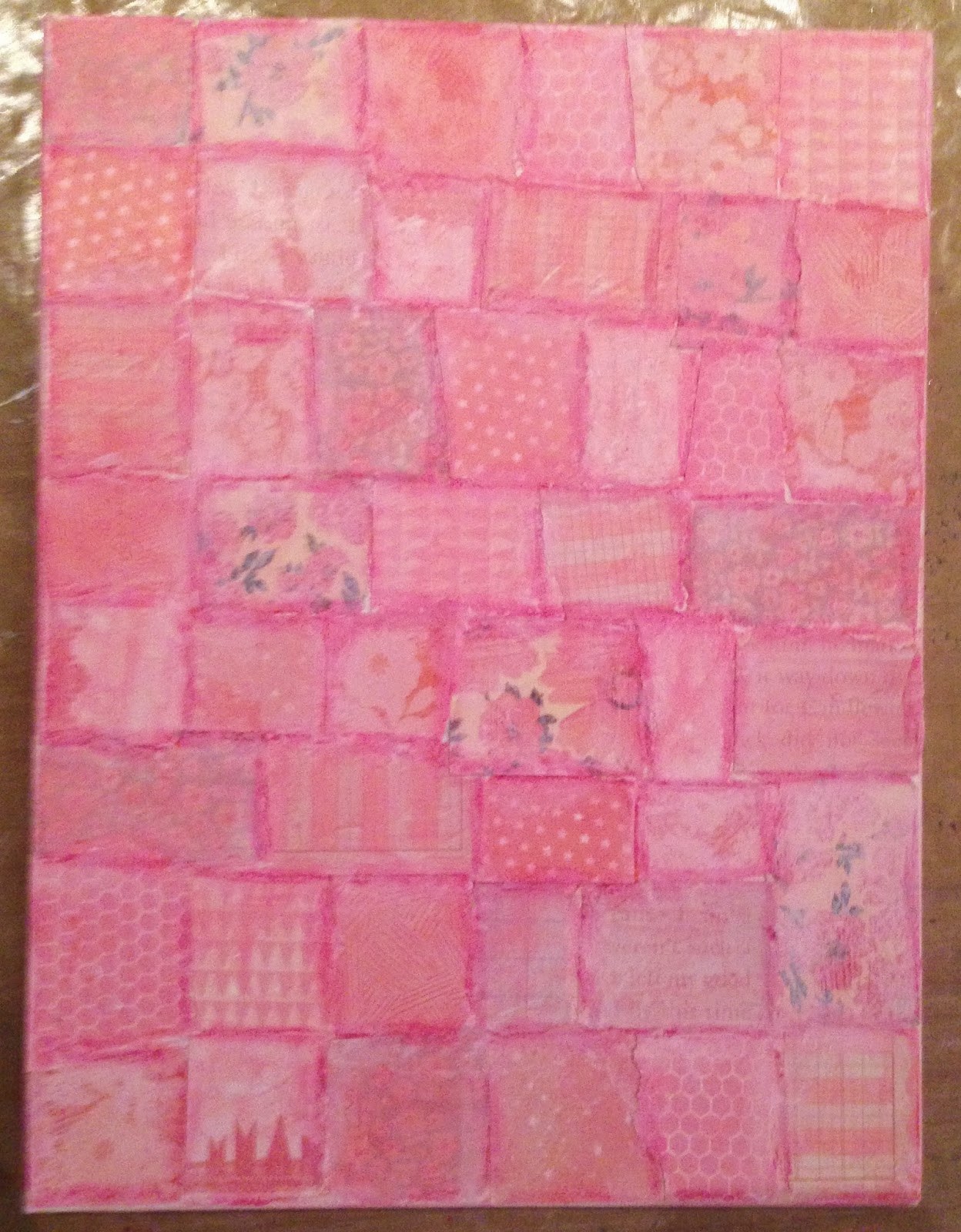 First, I gathered some pink patterned papers and adhered them to the canvas using Decoupage. I was inspired to make the patchwork background after watching a video by Christy Tomlinson where she made a patchwork background for her canvas. I colored the pieces with different colors of pink using Faber Castell Stampers Big Brush Pens. I also colored all the seams to make them stand out.